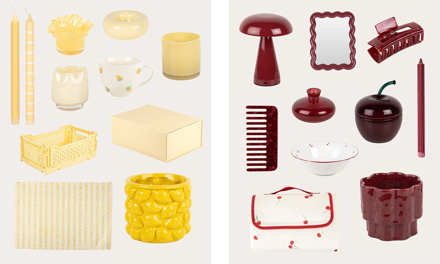 I kollaget ser vi vinröda ljus, en dekorativ vas, en skål med mönster och en söt förvaringsburk formad som ett körsbär. Här finns även personliga detaljer som en hårklämma, en spegel med vågig ram och picknickfilt med körsbärsmotiv.